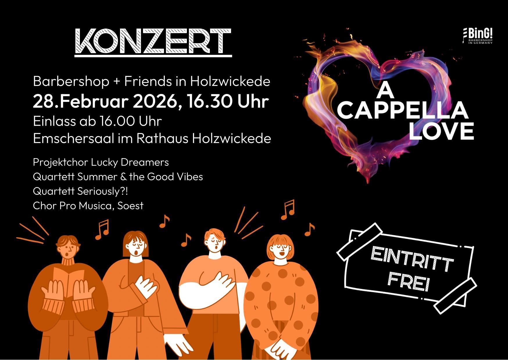 Der Projektchor 2026 probte dieses mal in Holzwickede. Die "Lucky Dreamers" präsentieren die Ergebnisse der Proben und haben sich dazu Gäste eingeladen: Die Quartette "Summer & The Good Vibes" und "Seriously?!" sowie den Soester A- cappella- Chor "Pro Musica".